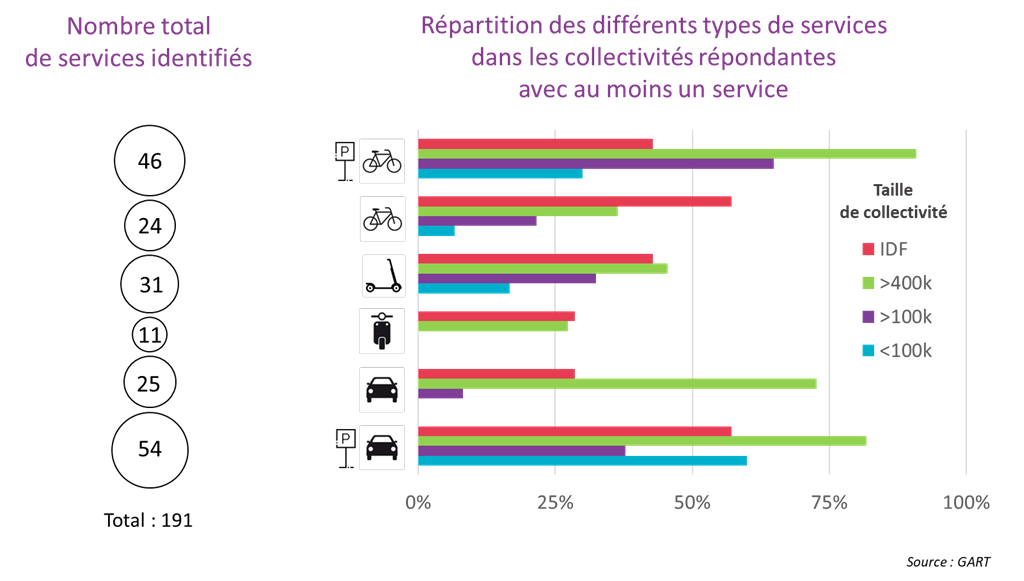 Les vélos en station et l’autopartage en station sont les types de véhicules en libre-service les plus répandus, mais les trottinettes et les vélos en free-floating sont eux aussi présents dans tous les types de territoires. L’autopartage sans stations et les scooters en free-floating ne sont en revanche présents que dans les plus grandes intercommunalités.
