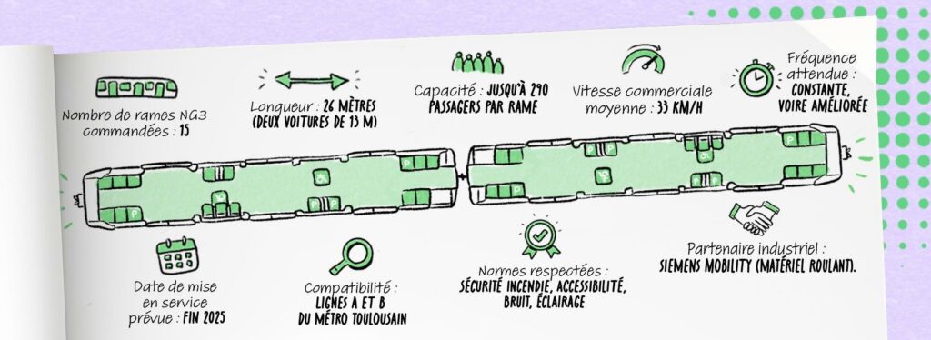 Avec plus de 450 000 voyageurs transportés chaque jour en période de pointe, le métro toulousain doit relever le défi d’une capacité accrue. Après l’allongement des rames de la ligne A, validé en 2020, le syndicat mixte avait acté l’acquisition de ce nouveau matériel. Trois premières rames ont déjà été livrées à l’été 2025 ; elles seront mises en service début 2026, les autres arrivant progressivement jusqu’à la fin de l’année. À terme, elles s’ajouteront aux 116 rames déjà en exploitation.