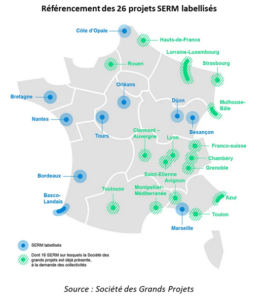 Les projets de SERM sont lancés à l’initiative d’une coordination entre les territoires locaux (métropoles et établissements publics de coopération intercommunale proches) et les régions. Ils ont pour objectif d’apporter des solutions de mobilités à l’échelle des bassins de déplacements et donc de dépasser les limites administratives actuelles des collectivités. Entre 2024, l’État a labélisé 24 premiers projets couvrant les principales métropoles françaises auxquels deux nouveaux projets (Dijon et Besançon) se sont ajoutés en 2025.